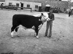 Joe Rosth, 4-H Club boy of Las Cruces, New Mexico, with the calf he showed at the 1941 Southwestern Livestock Show at El Paso, Texas. The calf was bred by George Cureton. Joe is wearing a dark jacket over a collared shirt and trousers. In the background are a brick building, an automobile, and people walking around the stockyards.