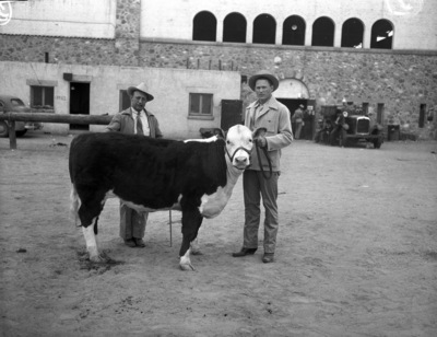Buddy Cummings, right, 4-H Club boy of Van Horn, Texas, with his calf at the 1941 Southwestern Livestock Show at El Paso, Texas. Buddy is standing next to the head of his calf, holding onto its lead and looking at the camera. He is accompanied by an unnamed man who is standing behind the calf, at left. Buddy is wearing a brimmed hat, a jacket and a pair of trousers. The unnamed man is also wearing a brimmed hat and a patterned jacket.