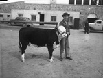 Billy Joe Short, 4-H Club boy of Sanderson, Texas, with his first prize medium weight Polled Hereford at the 1941 Southwestern Livestock Show at El Paso, Texas. Billy is standing next to the head of his cow, holding onto its lead and looking off to his right. He is wearing a dark hat, a jacket and a pair of trousers. The cow is primarily a dark color with the exception of its head and underbelly. In the background is a brick building with a truck parked in front of it.