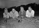 Left to right are Miss Bobby Gause, Ted Lewis, A. J. Van Arman and Chick Porterfield, waiting at the Rockwood Golf Course No. 7 tee. All four are lying on the grass on their stomachs. Miss Gause, Mr. Lewis and Mr. Porterfield are holding golf clubs and Miss Gause is also holding a golf ball in one hand. Miss Gause is wearing a blouse and headband, and the other three are wearing button-down shirts.