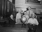 These boys took home the biggest share of the sales cash on their visit to the Fort Worth, Texas cattle market. They are, left to right, Herschel Reid, Jerome Spivey, Don Wetsel, Phillips Howard and Gordon Deason. Reid and Deason are sitting at a desk and the other three boys are standing. On the desk is a globe. Spivey, Wetsel and Deason are wearing cowboy hats. There is a calendar hanging on the wall at left. Behind them is a coat-rack with a hat and coat hanging on it. There is a map of Texas on the wall behind them.