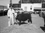 Bill Haseloff, 20, and his grand champion Hereford steer of the Wilbarger County 4-H Club show at Vernon, Texas. The steer weighed in at 905 pounds after going on feed scaling 475 pounds. He was under the feeding care of Mr. Haseloff for 206 days. The feeding was under the supervision of County Agent W. W. Evans and Assistant County Agent Bill Rector. Mr. Haseloff is standing outside, next to his steer. He is wearing a shirt, trousers, necktie and a hat. There is a group of unidentified people in the background as well as automobiles.
