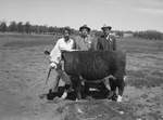 Standing outside, behind the grand champion steer of the Plainview, Texas, Fat Stock Show, are L. D. Ballad, who fed the 890 pound animal, O. B. Jackson, president of the Plainview 4-H Club and one of the show founders, and C. B. Martin, county farm agent. Mr. Ballard is wearing a shirt and trousers. Mr. Jackson and Mr. Martin are wearing suits and hats.