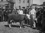 Bobby McCullough, right, and his reserve champion 845-pound Hereford calf at the Hardeman County 4-H and Future Farmers of America (FFA) Livestock Show. Mr. McCullough's calf was bred by the Rice Estate. He is wearing a shirt and trousers and is holding a hat. There is a crowd of people standing behind him.
