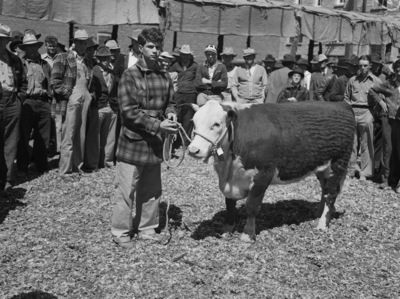Glendor McAdams and his blue ribbon calf that showed in the weighty division of the Hardeman County 4-H and Future Farmers of America (FFA) Livestock Show. The animal was bred by Leslie McAdams of Crowell, Texas. Mr. McAdams is standing next to his calf that is leashed with a rope. He is wearing a coat and trousers. There is a crowd of people standing in the background.