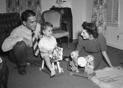 Tommy, center, 15-month-old son of Mr. and Mrs. Benton T. Walden, at 3800 Lenox Drive, Fort Worth, Texas. Tommy is sitting on a rocking horse with his father sitting on the floor behind him. His mother is on the other side of him, holding a child's toy. The toy has a rectangular base with wheels, and there are cutouts of two clowns and a drum standing on top of the base. Mr. Walden is wearing a collared shirt, necktie and trousers and Mrs. Walden is wearing a dress. Tommy is wearing a shirt and shorts. There is a couch and a chair in the background.