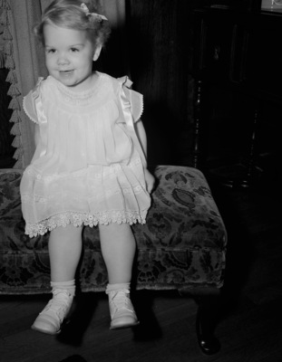 Patricia, 2-year-old daughter of Mr. and Mrs. Neville G. Penrose, of 1600 Merida Avenue, Fort Worth, Texas. She is sitting on a couch, smiling, wearing a dress.