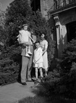 Adrienne Gay, 3, and Robert Gordon, 6, children of Mr. and Mrs. J. A. Gooch, of 6315 Rosemont Avenue, Fort Worth, Texas. Adrienne is being held by her father, and Robert and his mother are standing beside them. They are standing outside on a pathway leading to their front door. There are trees and shrubs on either side of the path. Adrienne and her mother are wearing dresses and Robert and his father are wearing suits. Mr. Gooch is wearing a hat.
