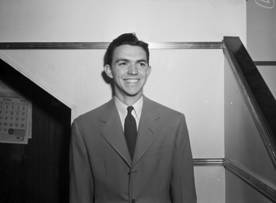 Texas Christian University (T. C. U.) is electing new student body officers for the 1941 school year. Wilson Baugh is the newly elected vice president. He is shown standing in a stairwell, dressed in a suit and smiling. There is a calendar hanging on the back wall. Published in The Fort Worth Star-Telegram morning edition, April 3, 1941.