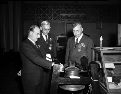 Inspecting an old bell which called Fort Worth's first public school children to classes in 1857 and now occupies an honored place in the Masonic Temple are (left to right); Sam B. Cantey Grand Master of the Grand Lodge of Texas; R. A. Massey, oldest living past master of the Fort Worth Lodge No. 148; George R. M. Montgomery, master of the lodge in 1918 and Grand Master of the Grand Lodge 10 years later. Published in Fort Worth Star-Telegram April 13, 1941.