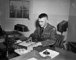 Maj. Gen. Walter Krueger, commander of the VIII Army Corps, Camp Bowie, Brownwood, Texas, 04/03/1941. Krueger sits at his desk looking at papers with a pen in his hand.