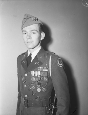 Cadet Colonel Walker K. Williamson, corps commander of Arlington Heights High School ROTC, in uniform displaying medals and military decorations. He will play an important role in the combined high school review and parade of the cadet corps to be staged on Sunday, April 6 at 4:30 pm in Farrington Field. Published in the Fort Worth Star-Telegram evening edition, April 4, 1941.