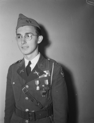 Cadet Lieutenant Colonel Jack Turner, corps executive officer from Paschal High School ROTC, in uniform displaying medals and military decorations. He will play an important role in the combined high school review and parade of the cadet corps to be staged on Sunday, April 6 at 4:30 pm in Farrington Field. Published in the Fort Worth Star-Telegram evening edition, April 4, 1941.