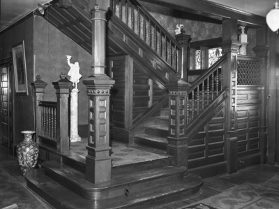Stairways; Houses; McCart, Robert (Mrs.); Sculpture; Stained glass; Urns