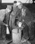 The small town of Imperial, Texas in Northern Pecos County was founded thirty-two years ago. Until recently, it was nothing more than a wind-swept "four-corner" community. With the oil boom rolling into town, Imperial is enjoying a prosperity they never anticipated. The oil field workers are left to right J. J. Hardin, Tom Hale and Bill Bomerman. The all work on the Magnolia Petroleum Company No. 2, Crockett, Texas. They are show inside the Abell pool.