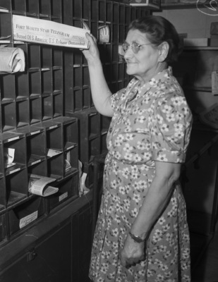 Abell Pool. Northern Pecos County. Mrs. Orpha Reinertsen, resident of Imperial 27 years and postmistress for 16 years, distributes the mail. Published in Fort Worth Star-Telegram, morning edition, April 6, 1941.