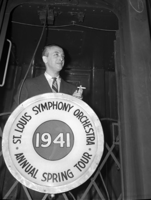Vladimir Golschmann, conductor of the St. Louis Symphony Orchestra, as he and the orchestra arrived in Fort Worth, Texas, to perform at the Municipal Auditorium. Mr. Golschman is standing behind a circular sign that reads, "St. Louis Symphony Orchestra - Annual Spring Tour," from the rear vestibule of the train he arrived on. He is holding a cigarette in his left hand and is wearing a dark suit and a striped tie.