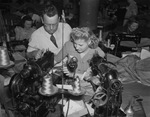 Miss Ruth Martin operating a sewing machine that makes the buttonholes for the army pants produced by the Williams-Dickie Manufacturing Company. J. B. Copeland, an engineer, is standing beside her, inspecting the operation of the machine. The two employees are surrounded by several machines and spools of thread. Miss Martin is wearing a short-sleeve dress and Mr. Copeland is wearing a short-sleeve, striped shirt, a tie and eyeglasses. Behind them are other women working with similar machines. The manufacturing company produces approximately 6,000 pairs of army pants daily.