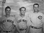 Fort Worth Cats baseball players (left to right) Eldon Hill, catcher, Joe Yourkovich, and Ed Greer, pitcher. The three men are standing next to each other on a field and looking off to their lefts. Hill's and Yourkovich's uniforms include jerseys that read "Fort Worth" across the front, and Greer's uniform is striped and his jersey has the Cats' logo.