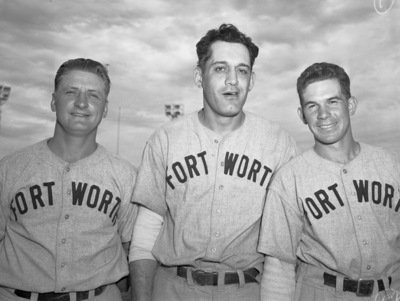 Fort Worth Cats baseball players (left to right) Charles Baron, Hank Oana, and Bill Skelley. The three men are standing next to each other on a field, shoulder to shoulder. They are wearing matching Fort Worth Cats baseball uniforms. Their jerseys read "Fort Worth," across the front.
