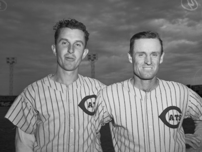 Fort Worth Cats pitchers (left to right) Johnny Brysch and George Milstead. The two men are standing next to each other on a field, wearing matching Cats' baseball uniforms. On their jerseys is the logo for the Fort Worth Cats.