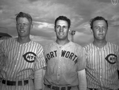 Fort Worth Cats baseball players (left to right) Ben Parrish, Dan Carnevale and Marcus Beddingfield, pitcher. The three men are standing next to each other on a field. Parrish and Carnevale are smiling and looking off to their rights. Parrish and Beddingfield are wearing striped uniforms with the Fort Worth Cats logo on the jerseys, and Carnevale is wearing a solid-colored uniform with "Fort Worth," across the front of the jersey.