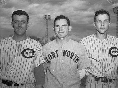 Fort Worth Cats baseball players (left to right) Tom Calahan, Don Looney and McEwan Palmer. The three men are standing next to each other on a field. Calahan and Palmer are wearing striped uniforms with the Fort Worth Cats logo on the front of the jerseys, and Looney is wearing a solid-colored uniform with "Fort Worth," across the front of the jersey.
