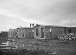 Three of the new buildings of Abell City, Texas, in their skeletal structure. There are piles of wood, rock and construction materials on the ground beside the buildings. Three unnamed men are standing on the roof of the center building and one man is standing next to a ladder leaning against the building. In the foreground is a puddle of water.