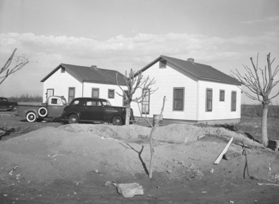 Shot of two new, fully constructed buildings in Abell City, Texas, a new oil town in West Texas. There are three automobiles parked in front of the buildings. In the foreground is a pile of dirt and construction materials. There is a person coming out of the door of the building on the left.