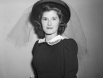 Portrait of Mrs. Nathaniel W. Childs, the former Miss Dorothy M. Hampton, daughter of Mr. and Mrs. Wade Hampton of Azle, Texas. Her wedding took place at Trinity Episcopal Church. Mr. and Mrs. Childs are at home at 5408 El Campo Avenue, Fort Worth, Texas, address of the bridegroom's mother, Mrs. Elizabeth Childs. Mrs. Nathaniel W. Childs is wearing a long-sleeved dress and a hat with a veil.