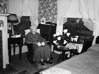 Mrs. Robert McCart, shown in her home with some of her antiques. Mrs. McCart is sitting on a rocking chair in the corner of a bedroom by two large windows. She has a book on her lap and is smiling. Her feet are propped up on a pillow. Partially seen is a bed in the foreground and a fireplace on the left. A vase of flowers is on an end table by the bed. (no clipping)