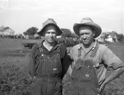 Jacob S. Franz, left, and P. U. Claassen are the feeders and owners of cattle from the Swenson ranches of West Texas. Claassen's farm is in Whitewater, Kansas. The farmers are standing in a field. They are both wearing long-sleeve, collared shirts, overalls and straw hats.
