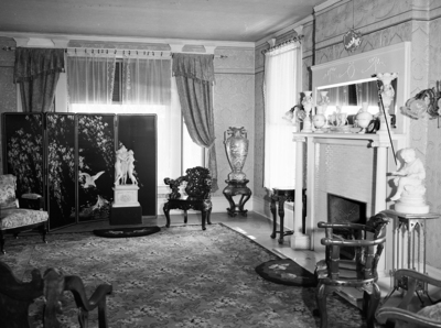 Image is of an interior shot of Robert McCart's home, showing a fireplace, chairs with what looks to be an ornate Chinese screen divider on the left right of the picture. (no clipping)