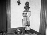 Image is of an interior shot of Robert McCart's home, showcasing a bookshelf in the corner of the room, with a statue bust on top next to another metal figurehead on the wall. (no clipping)