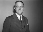 Chalmers W. Hutchinson standing in front of an empty wall, wearing a three-piece, pinstripe suit with a striped shirt underneath and a dotted tie. There is a handkerchief in his suit jacket breast pocket. He is looking off to his right.