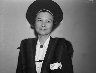 Mrs. H. S. Renshaw, former teacher, who was elected to a six-year term on the Fort Worth Independent School District board of trustees. Mrs. Renshaw is standing in front of an empty wall, wearing a coat with a fur trim, a collared blouse and a hat. There is a handkerchief in the coat breast pocket. Pinned to her blouse, at the center of the collar, is a brooch.