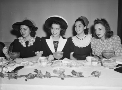 Pictured at the annual Spring luncheon of the Inter-Sorority Council at Hotel Texas are, left to right, Miss Sarah Cooke, treasurer if the council; Barbara Jean Taylor, president; and Miss Claribel Steele and Miss Charlotte Walters, members of the committee which arranged the luncheon. All of them are sitting at a dining table. Miss Cooke, Miss Taylor and Miss Steele are wearing hats. On the table are bowls, spoons, plates with food, salt shakers and flower arrangements.