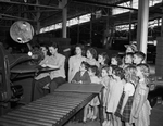 Image shows students at Oak Grove Elementary School visited the airport, Texas and Pacific Station, Forest Park Zoo and several Fort Worth Plants. Here, the students, their teacher, Miss Lila Ann Butner (extreme right), and several of the students' mothers are shown watching an employee of a South Side factory run a machine which clamps card-board boxes. Published in the Fort Worth Star-Telegram morning edition April 4, 1941.