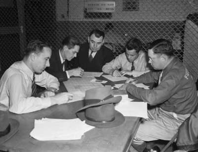 Farm Shop work graders at North Texas Agricultural College, members of the Future Farmers at Arlington. They are, left to right, Ben Horton, Cedar Hill, Texas; J. C. Parks, Frisco, Texas; P. C. Gentry, Justin, Texas; Floyd Carson, Southmayd, Texas; and T. C. Gibbs of Paradise, Texas. All the men are sitting at a table reviewing documents. Behind them is a chain-link wall, with a sign that reads, in all caps, "PLEASE DO NOT SIT ON DESK." Mr. Parks and Mr. Gentry are wearing suits and the other men are wearing collared shirts and neckties.