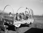The Mesquite School float that rode through the parade at the Borden County 50th anniversary celebration. Standing on the float is Keva Lou Hays, dressed as the Statue of Liberty. Seven other children are seated on the float as well, which is decorated with thin, striped arches and banners. The banners read, "Education is the Key to Liberty" and "Mesquite." Keva is holding up a large key in her right hand.