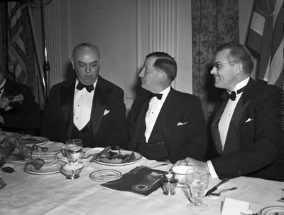 Among those attending the Exchange Club's 17th Golden Deeds Banquet at the Fort Worth Club were, left to right, Charles F. Roeser, of Fort Worth, Texas; John R. Suman, of Houston, Texas; and K. S. Adams, of Bartlesville, Oklahoma. The three men are sitting next to each other at dinner table that is decorated with a tablecloth and has an array of plates and glasses. The plate in front Mr. Suman is filled with slices of meat. All three men are wearing tuxedoes and bow ties. Mr. Roeser and Mr. Adams are also wearing eyeglasses. Part of a flag can be seen behind Mr. Roeser and part of another flag can be seen behind Mr. Adams. These three were among the speakers who paid tribute to E. A. Landreth at the banquet as Fort Worth, Texas's, outstanding 1940 citizen. Mr. Suman is vice president of Humble Oil and Refining Company. Mr. Adams is president of Phillips Petroleum Company.