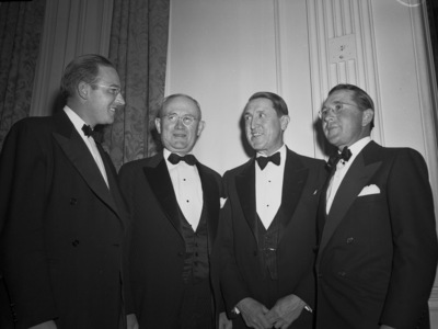 Among those attending the Exchange Club's 17th Golden Deeds Banquet at the Fort Worth Club were, left to right, W. A. Landreth, of Fort Worth, Texas; H. H. Landreth, of Joplin, Missouri; J. P. Landreth, of Evanston, Illinois; and Luther A. Neal, of Odessa, Texas. These four were among the hundreds present to honor E. A. Landreth as Fort Worth, Texas's, outstanding 1940 citizen. The men are standing in front of a wall, all wearing tuxedoes and bow ties. W. A., H. H. and Luther are also wearing eyeglasses. W. A. Landreth is the honoree's son, H. H. and J. P. are his brothers, and Luther is his nephew.