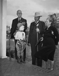 Former cowboys of the old Three Nines Ranch met in reunion at Baird's Farm near Arlington, Texas. At the reunion were, left to right, Mascot Bill Taylor, of Dallas, Texas, grandson of a former Three Nines cowboy; Charles Ferguson, of Crowell, Texas; George Thompson, of Iraan, Texas, and Mrs. Please Cooper, of Crowell, Texas, widow of one of the Three Nines cowboys. They are standing on the porch of a building. The young Bill is wearing a cowboy outfit complete with a cowboy hat, boots, and gun holster. He is holding a pistol with both of his hands as he looks on at Mrs. Cooper, and in his holster is another gun. Mrs. Cooper is wearing a dark dress that is blowing in the wind and a pair of eyeglasses. She is also holding a handgun in her right hand, pointing it at the ground. Mr. Ferguson and Mr. Thompson are wearing dark suits. Mr. Ferguson is wearing eyeglasses and Mr. Thompson is wearing a cowboy hat. Both men are holding long rifles that are pointed upward.