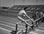 Leonard Roach, student at Masonic Home and School, skimming over the high hurdles during a race as the Masons captured the district track and field meet at Farrington Field. Mr. Roach is shown in the midst of leaping over a striped, wooden hurdle. Both of his legs and arms are extended and he is wearing a t-shirt and shorts. At the far right, beside the race track, are a few boys looking on at the race. In the background, bleachers can be seen along with the rest of the athletic field.