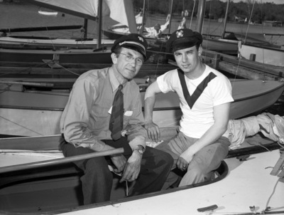 J. L. Hayward, left, of the Oklahoma City Boat Club, was skipper of the winning snipe in the opening race of the Lake Worth Sailing Club regatta. John Henry, right, also of Oklahoma City, Oklahoma, was crew. The two men are sitting next to each other on a sailboat. Mr. Hayward is wearing a pair of trousers, a striped tie, a buttoned-up shirt, eyeglasses and a sailor cap. Mr. Henry is wearing a t-shirt with a large, dark V on it, and a pair of trousers and a sailor cap. Behind them are other docked boats and some of the dock can be seen at the far right.