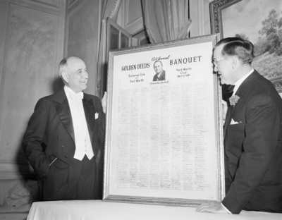 E. A. Landreth, right, and Amon Carter looking at the scroll presented Landreth.