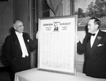Edwared Alvin Landreth (right) and Amon Carter, Sr. (left) standing beside a large framed poster being awarded to Landreth. The poster reads: "17th Annual Golden Deeds Banquet, Exchange Club of Fort Worth, Fort Worth Club, April 5, 1941" around a headshot of Landreth. The bulk of the poster is taken up by signatures.