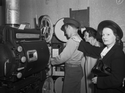 Two women went on inspection during Army Day at Camp Wolters. Left to right are Private Raymond Green, Mrs. Sadie Burns, and Mrs. Dan McCarty. They are seen inspecting the projection room of one of the three camp theaters. Private Green is a senior projectionist, on detached service from Fort Sill, Oklahoma. He is dressed in his military uniform. Mrs. Burns is wearing a hat with a flower and a coat. Mrs. McCarty is dressed in a hat and a dark coat. Her purse is tucked under her arm. Both women are from Fort Worth, Texas. Published in Fort Worth Star-Telegram, morning edition, April 8, 1941.