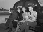 Smiles are plentiful with the wives of two soldiers visiting Camp Wolters for Army Day. Sitting on the running board of an automobile left to right are Sergeant Joe T. Bybee, Mrs. Bybee, Mrs. Ernest Bramlett, and Corporal Bramlett. They are all from Paris, Texas. Sergeant Bybee works in Company A, 64th Training Battalion. He is dressed in a side cap and his military uniform. Mrs. Bybee is wearing a coat. Mrs. Bramlett is dressed in a polka-dot blouse and a plaid skirt. Corporal Bramlett works in the Headquarters Detachment , Corps Area Service Command. He is wearing a peaked cap and his military uniform. Published in Fort Worth Star-Telegram, morning edition, April 8, 1941.