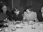 The Weatherford Rotary-Lions Club is holding a joint luncheon to honor Brigadier General William Hood Simpson. The general is a native son of Parker County, Texas and the commander of Camp Wolters. Attending the luncheon left to right are G. C. Boswell, Mrs. Boswell, Mrs. Fred Measures and Mr. Measures. Mr. Boswell is the Rotary president. He is dressed in a suit. Mrs. Boswell is wearing a hat with feathers and a dress with embroidered sleeves. Mrs. Measures is wearing hat and a button-up dress. Her pince-nez glasses are hanging from her collar. Mr. Measures is the Lions president. He is dressed in a three piece suit. Published in Fort Worth Star-Telegram, evening edition, April 9, 1941.